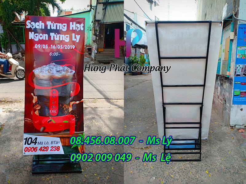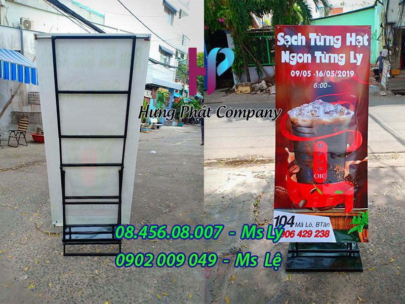 - Khung sắt được chia làm 3 phần gồm phần đế sắt đặc 3-5kg, phần khung đỡ banner quảng cáo và phần chân dựng nghiêng chống đỡ. Với kết cấu từng phần nên dễ di chuyển từ nơi nay sang nơi khác.